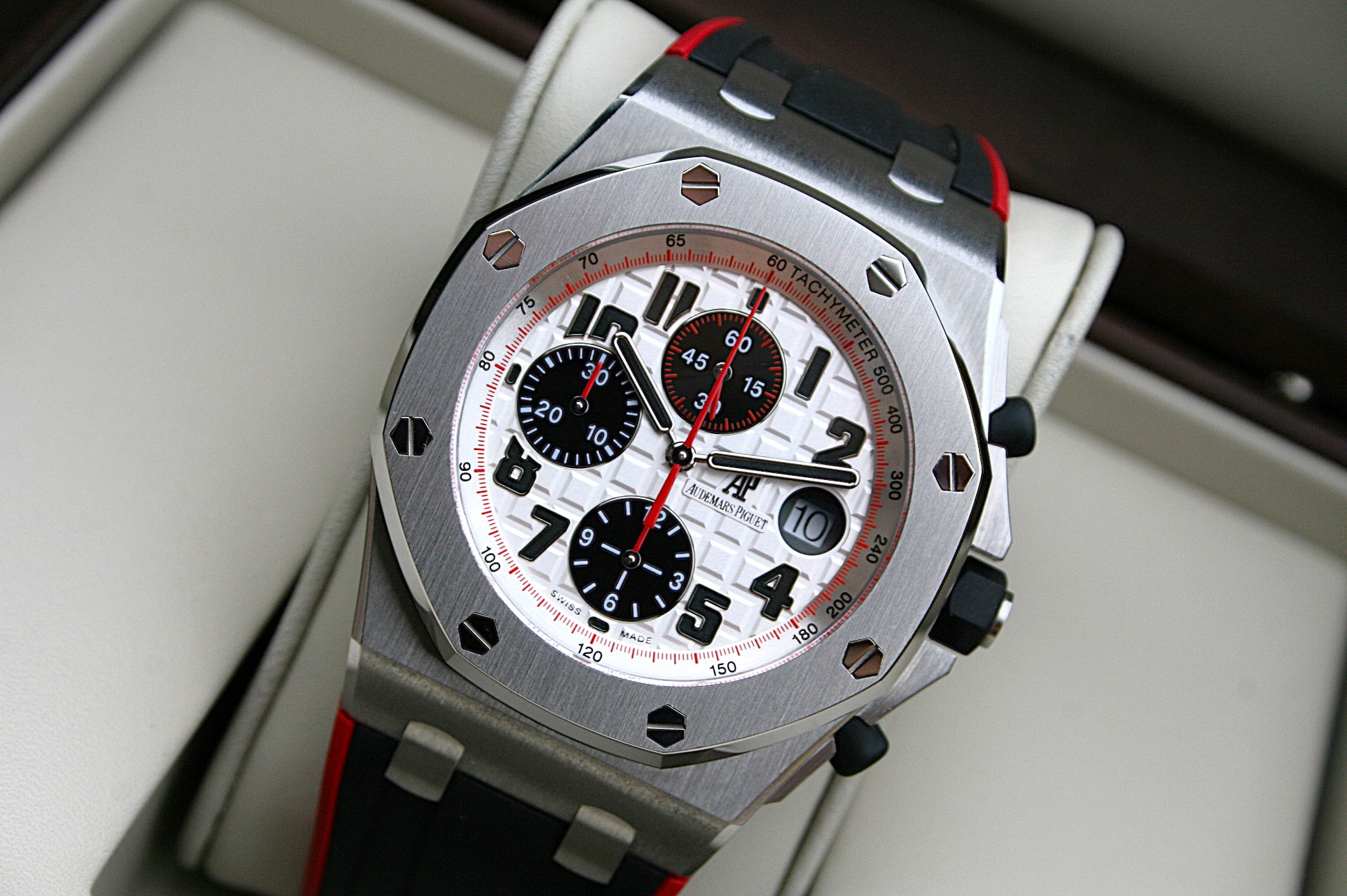 This Offshore comes in 42MM Stainless Steel Case with White Panda dial and a Red hint.