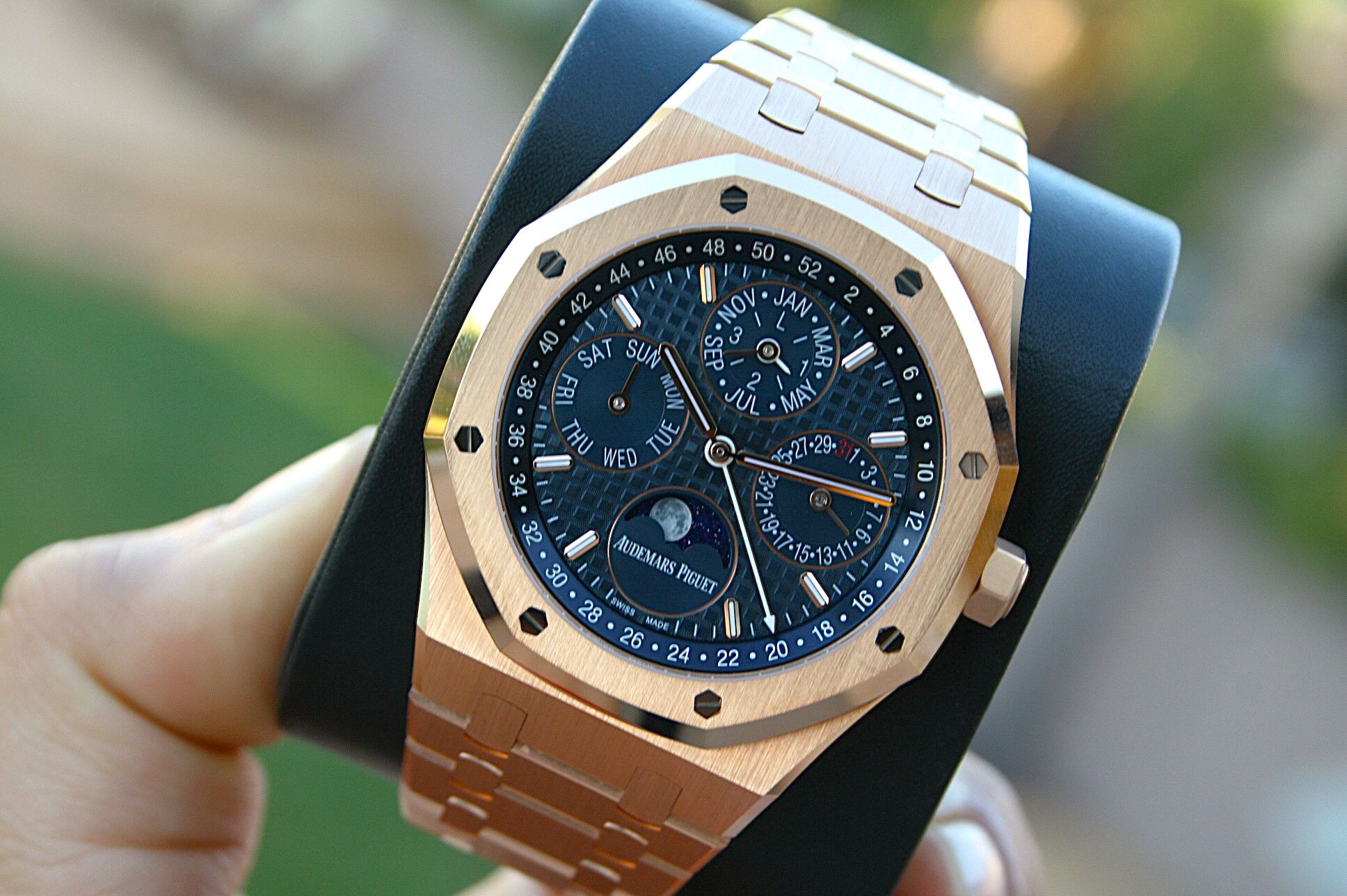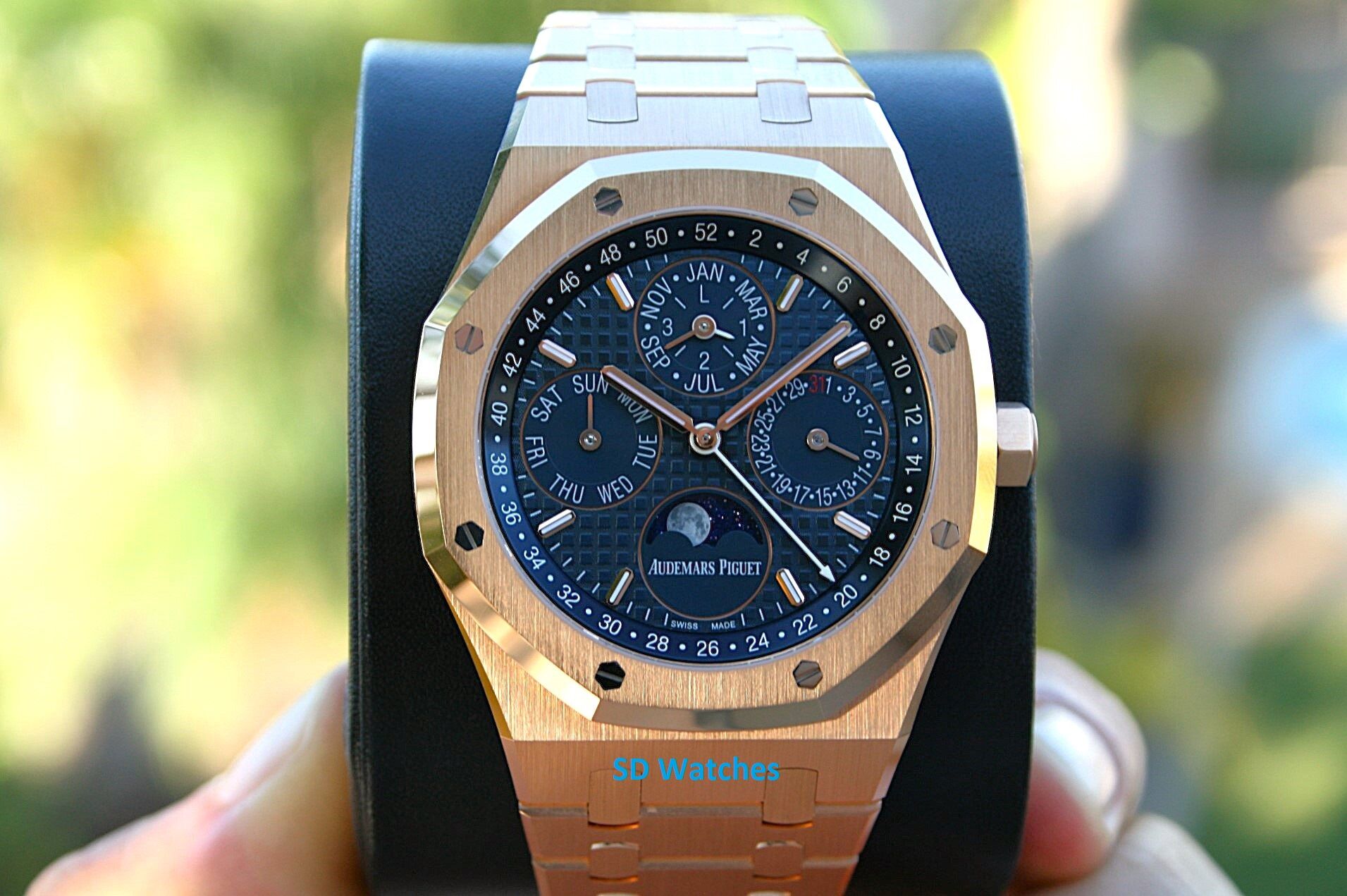 This watch comes in 18K Rose Gold with blue dial, 41MM case with Perpetual Calendar.