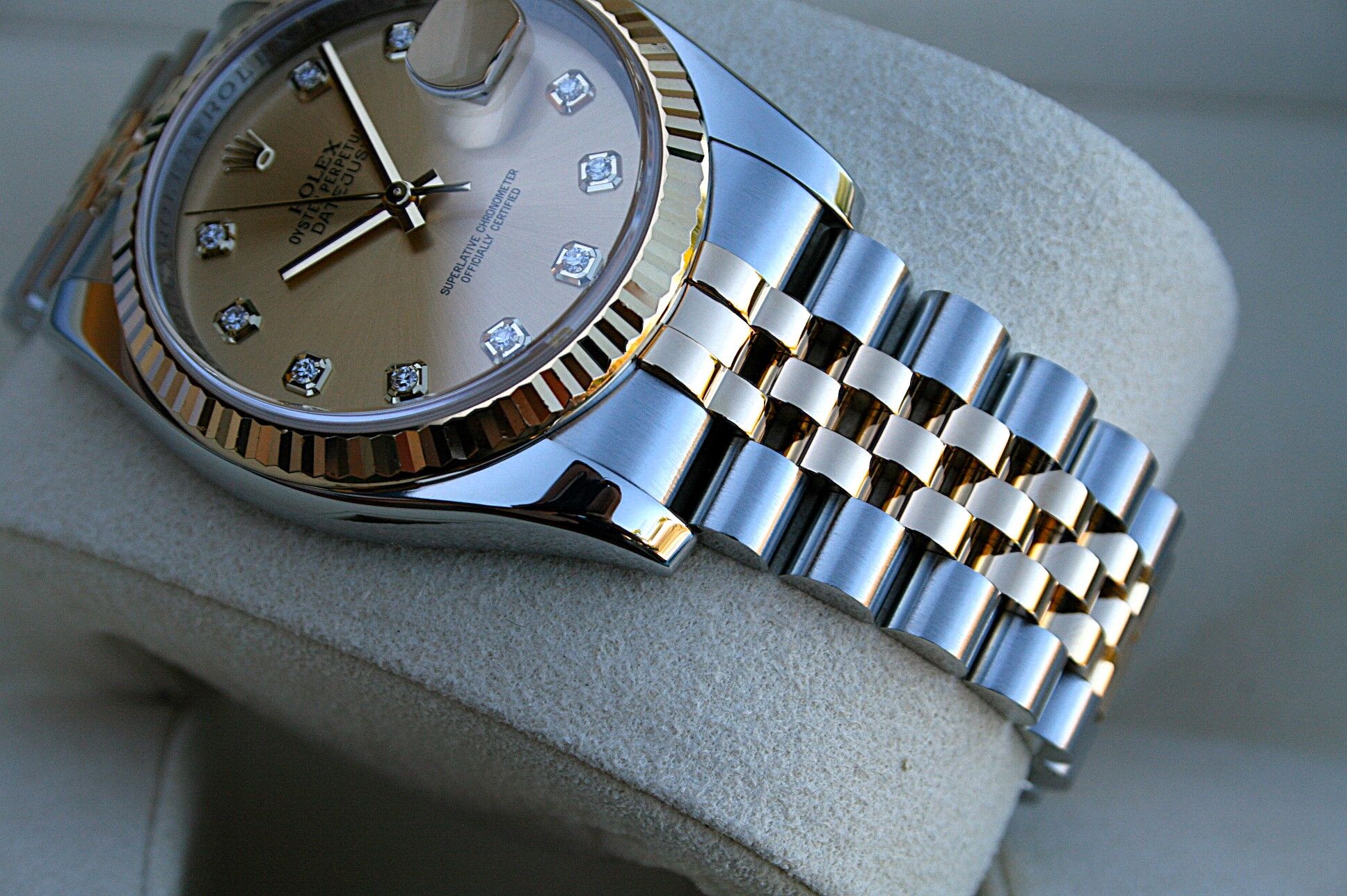 This watch comes in 18K Yellow gold and stainless-steel case, 36MM with Fluted bezel, Jubilee Band and Champagne Diamond dial.