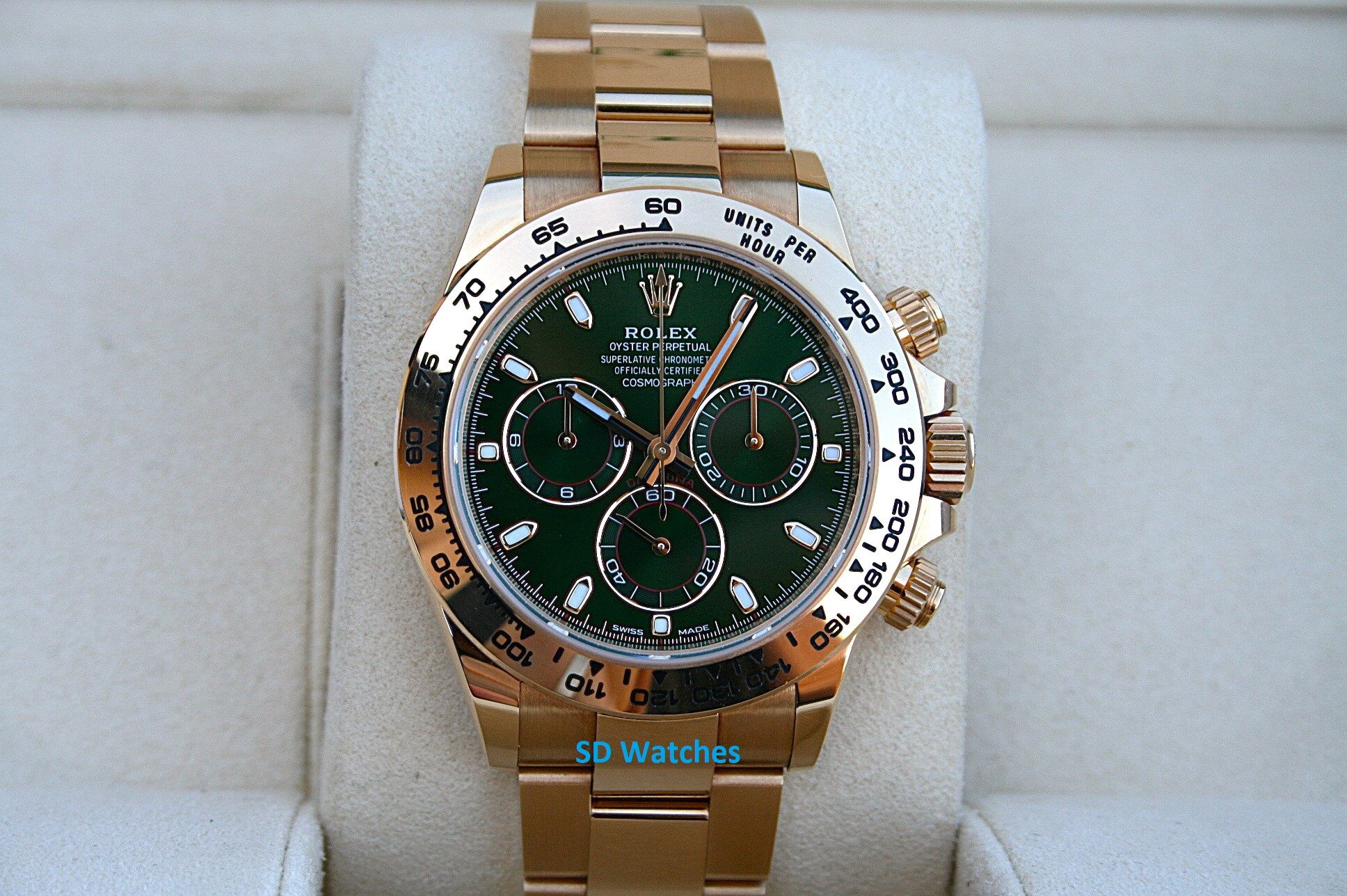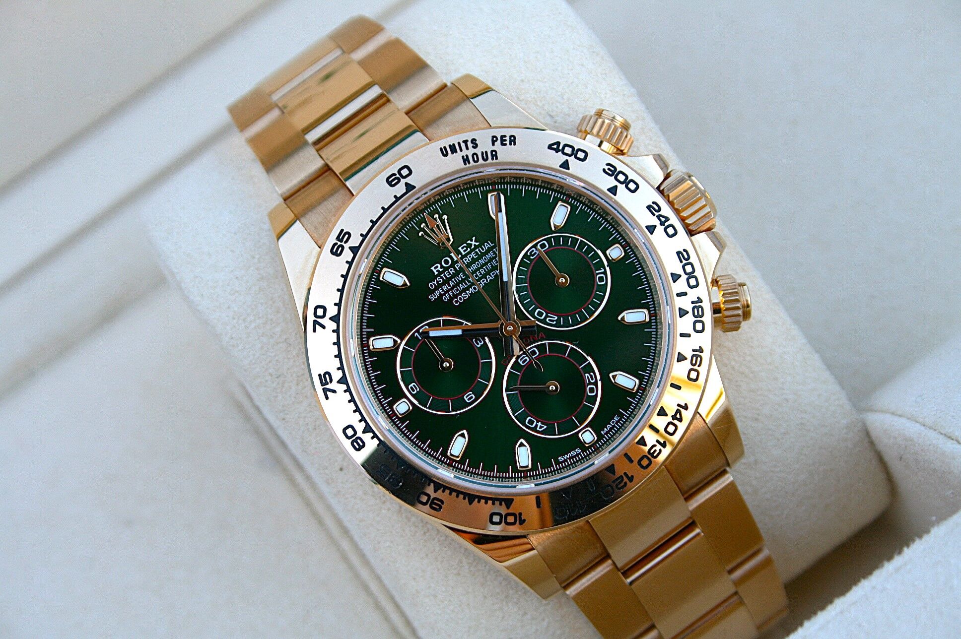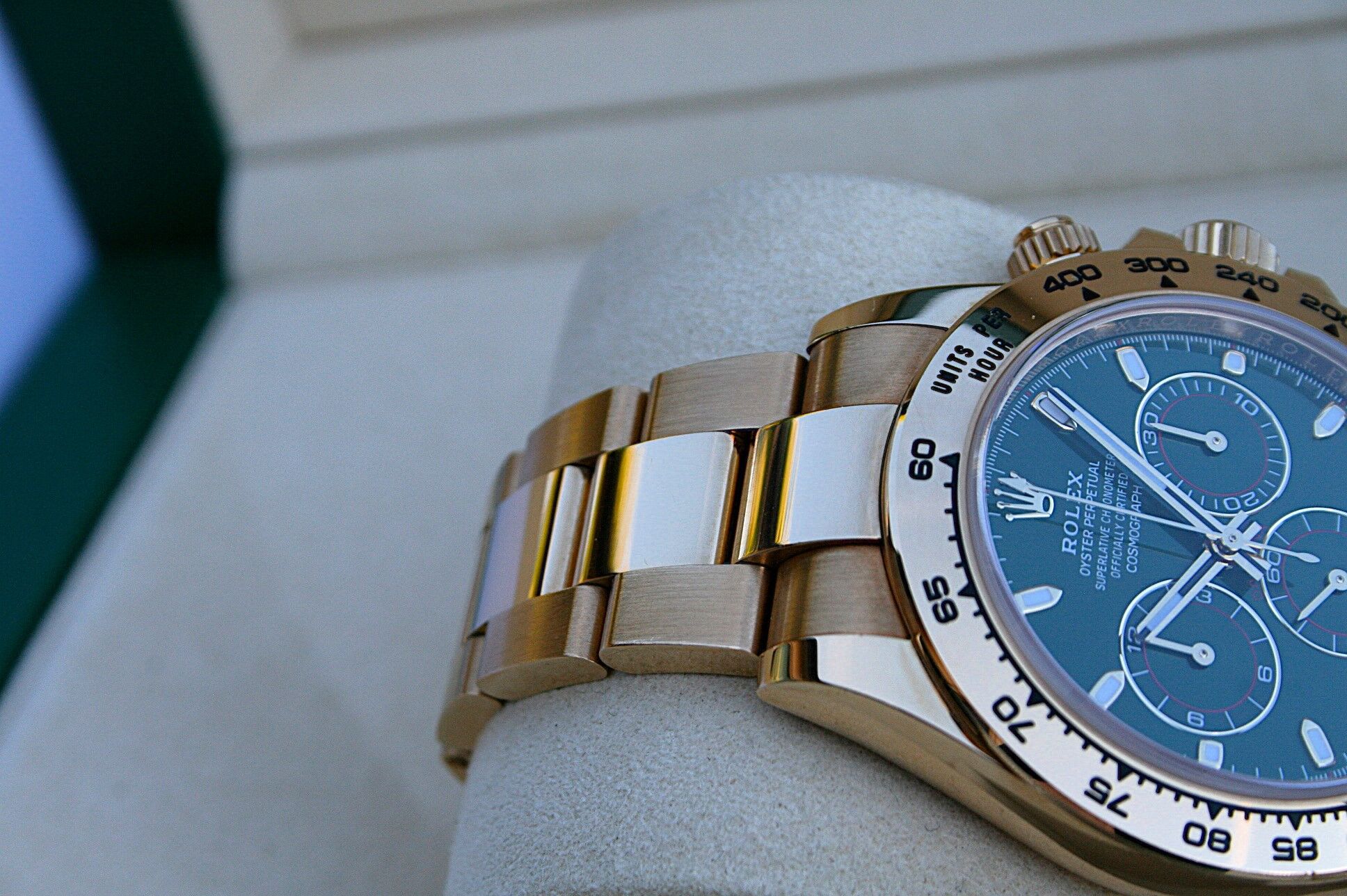 This watch comes in 18K Yellow Gold with Green Dial known as John Mayer Daytona.