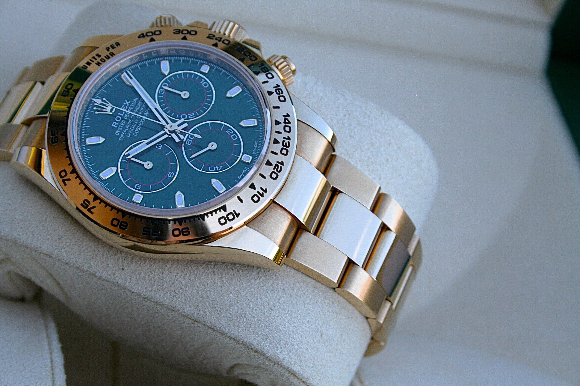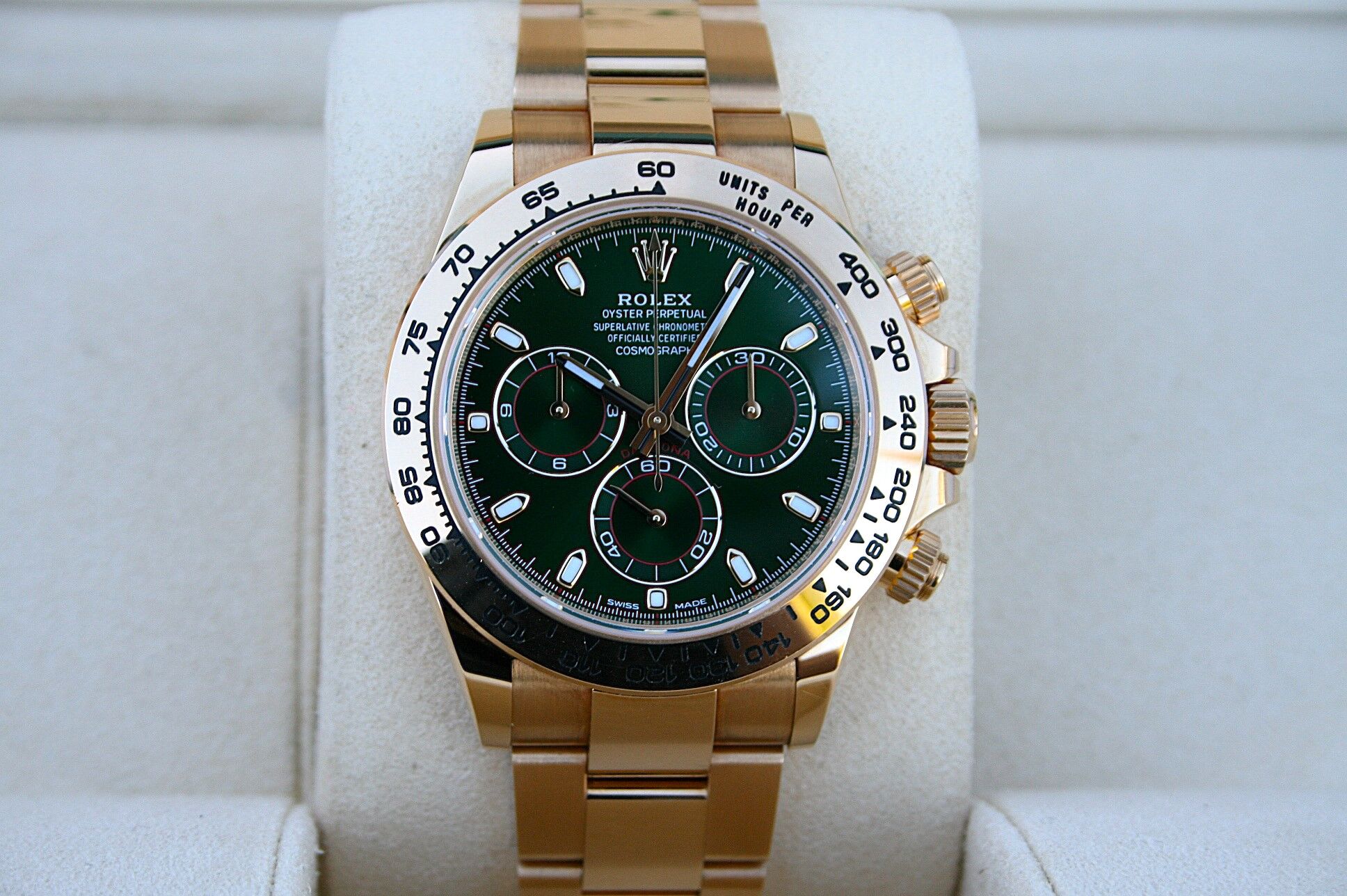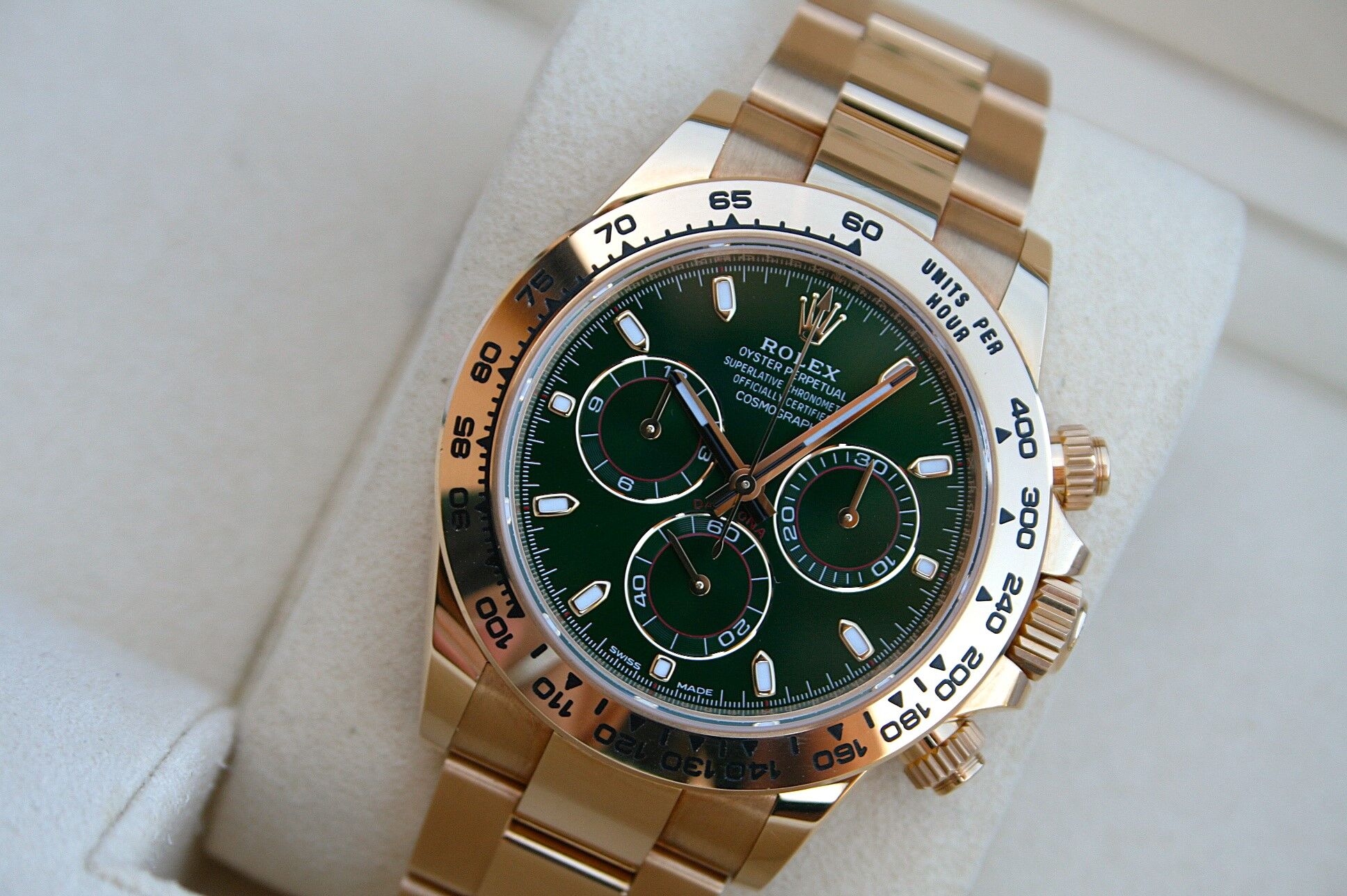 This watch comes in 18K Yellow Gold with Green Dial known as John Mayer Daytona.