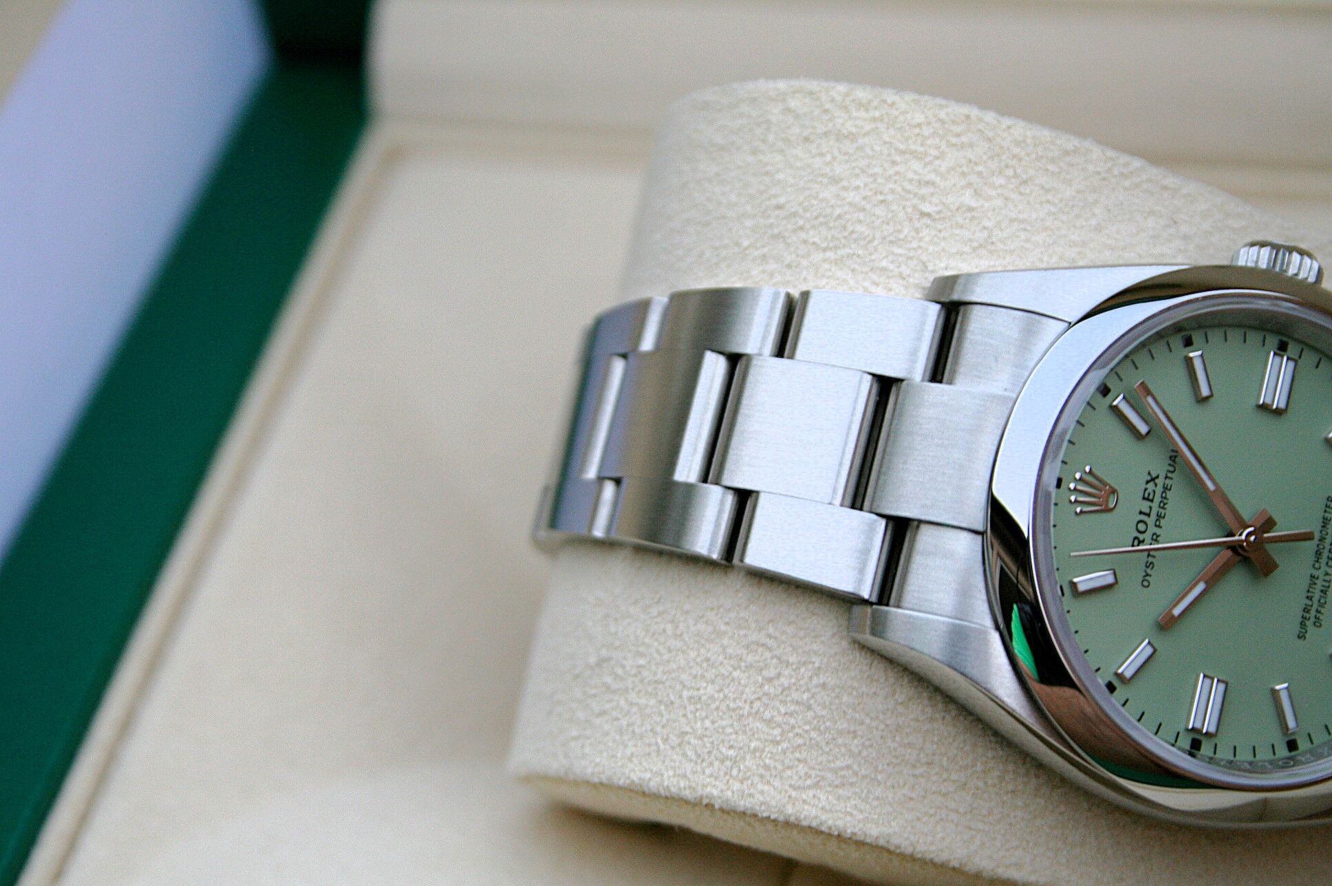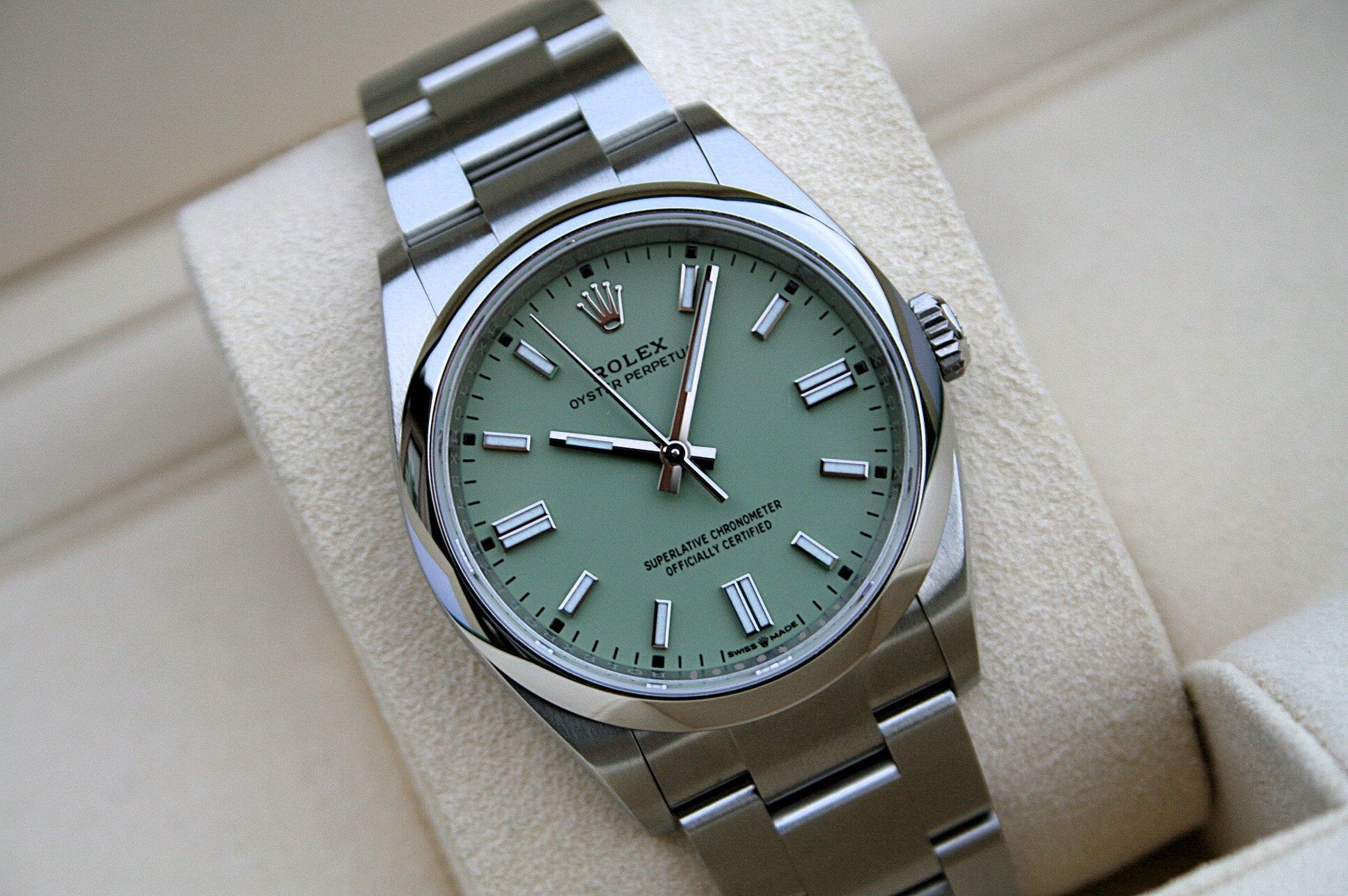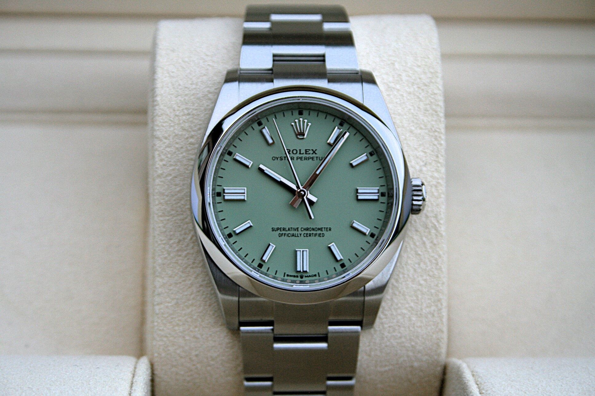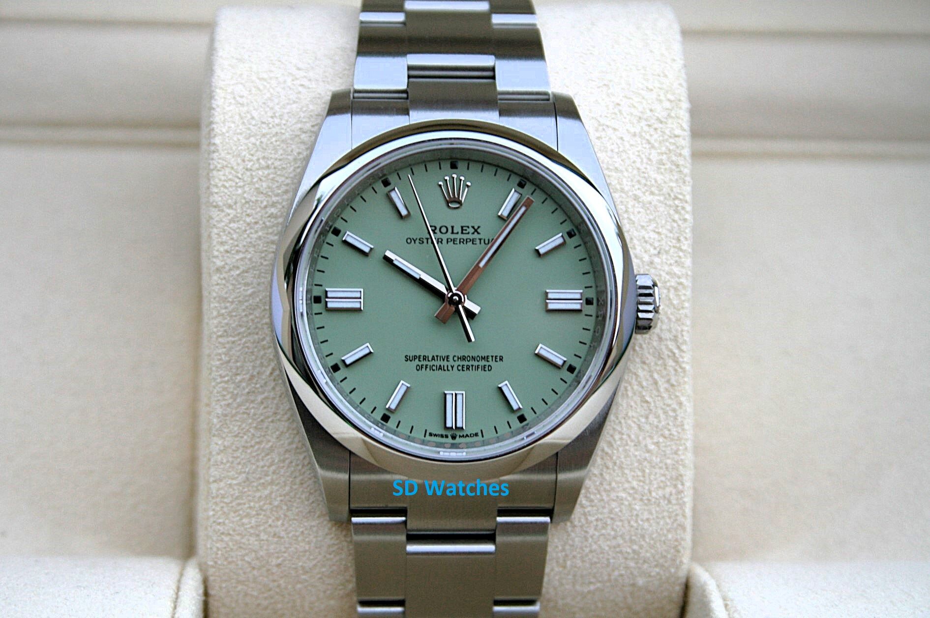 This watch comes in 36MM case, Stainless Steel with the newly released pistachio dial.