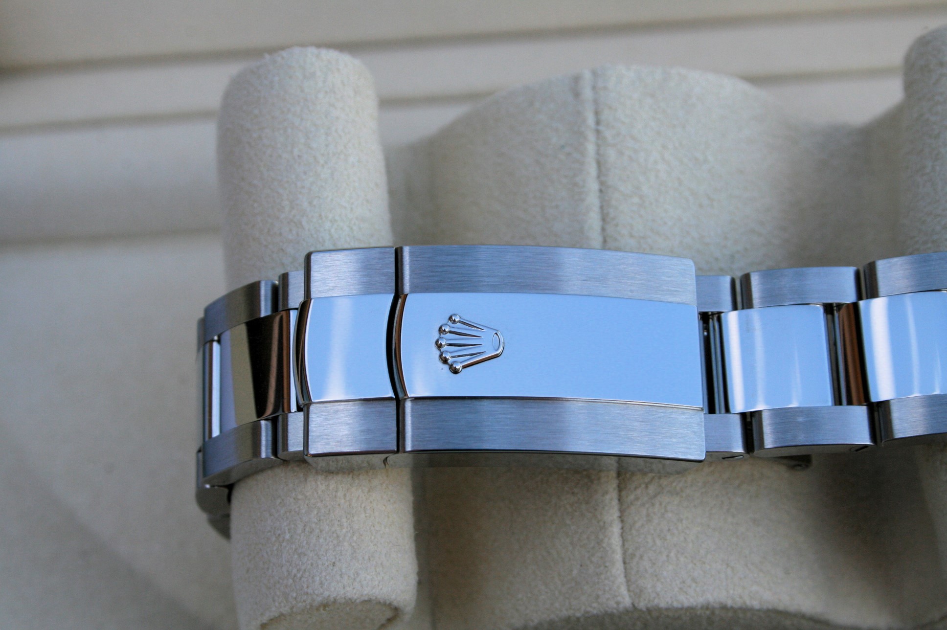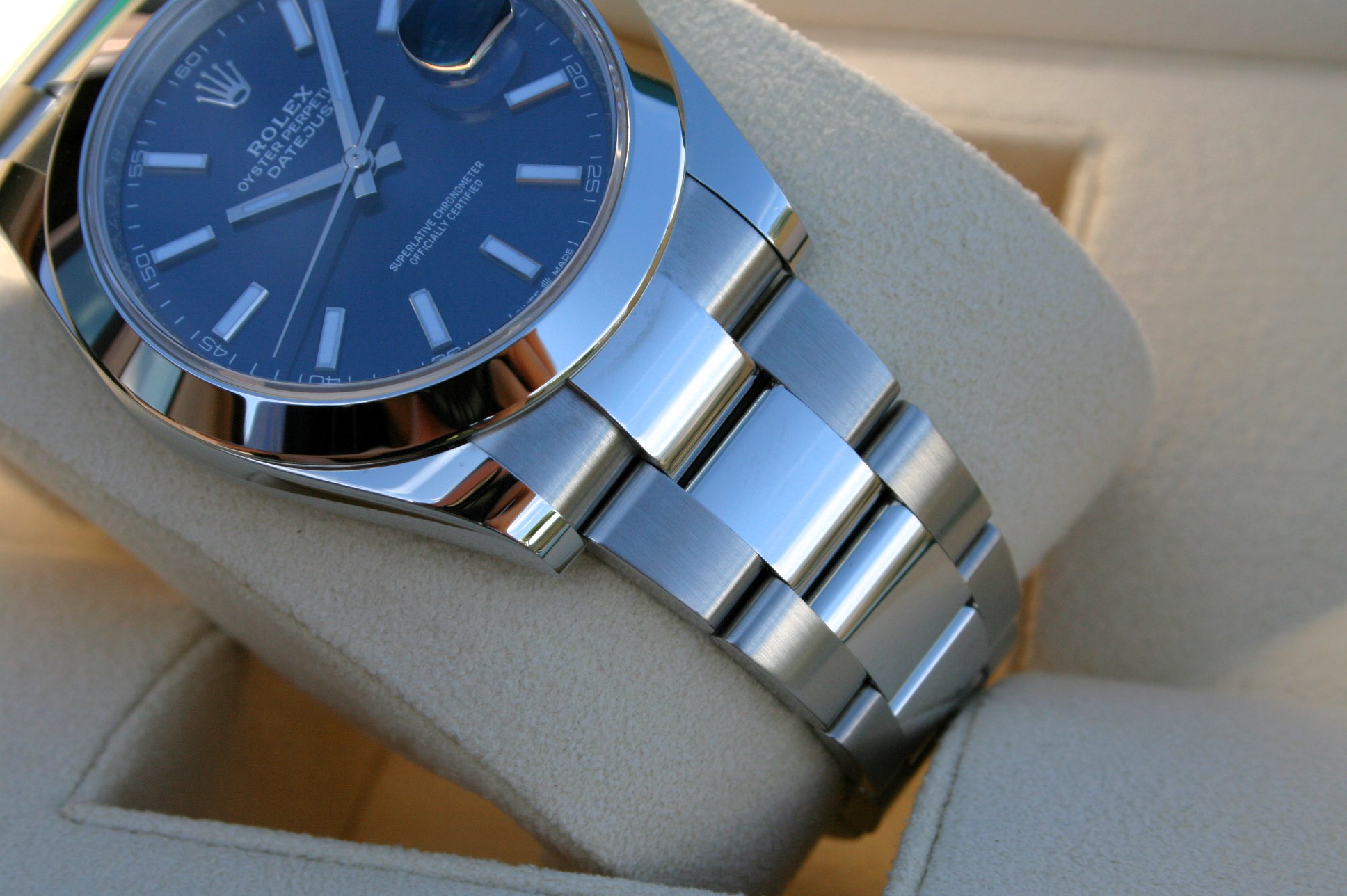 This watch is 41mm, it comes on oyster band with a Blue Stick and a smooth bezel.