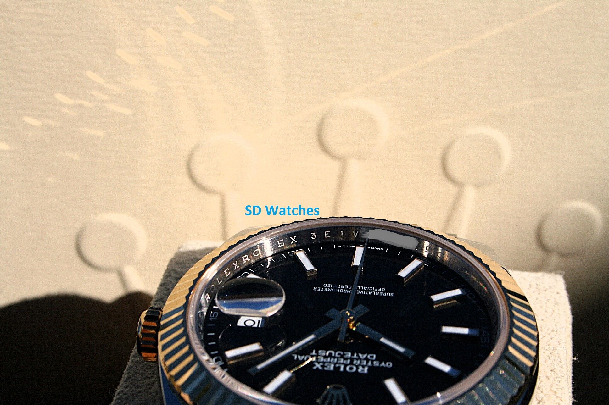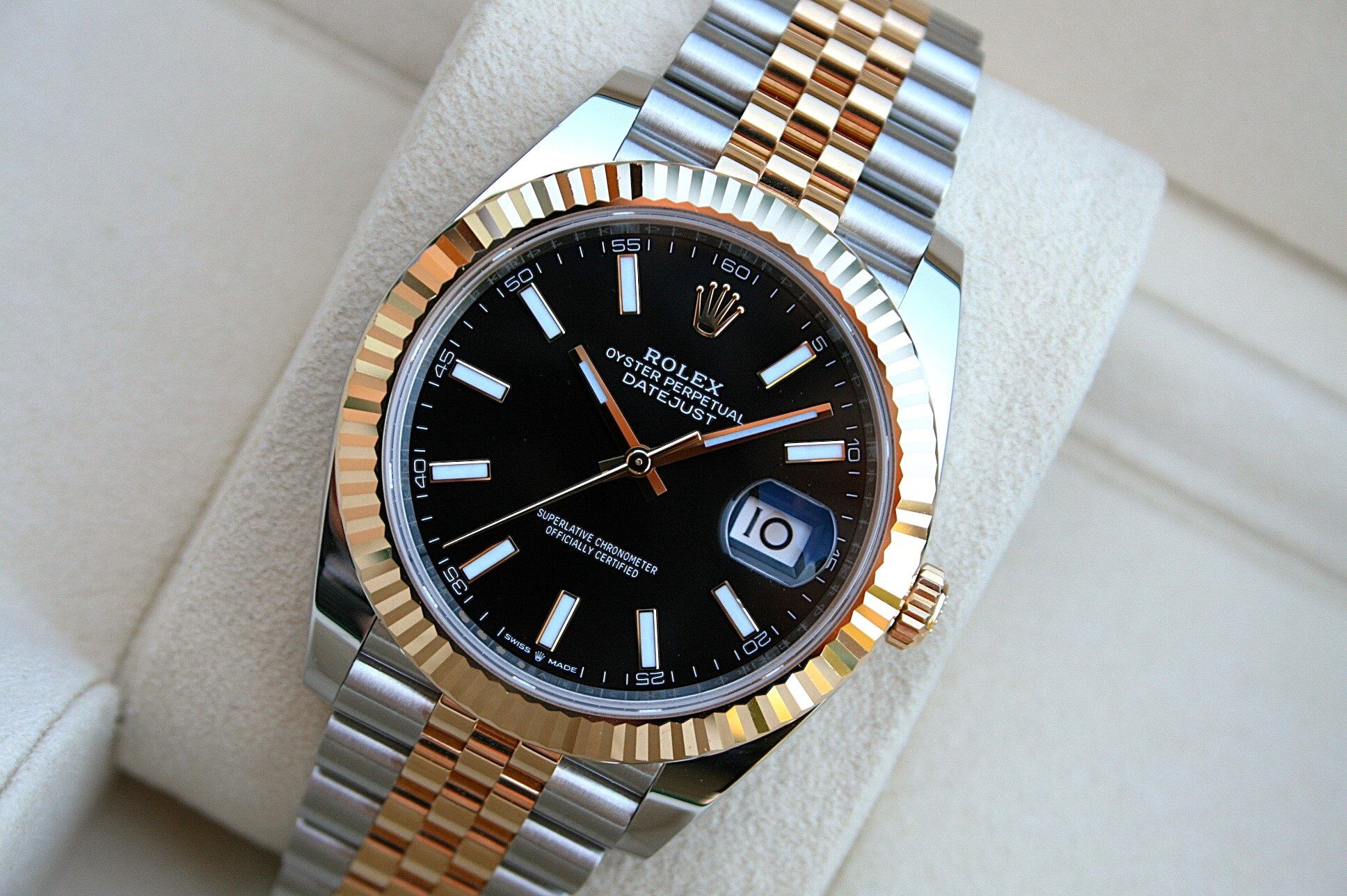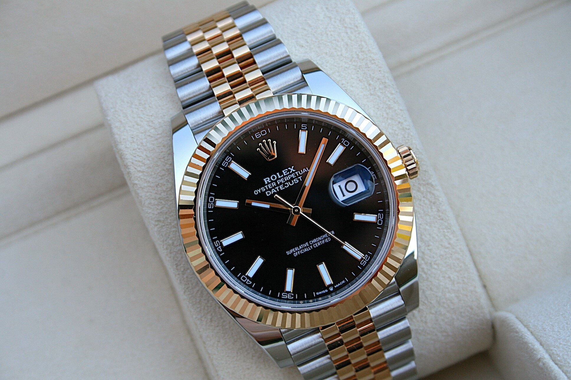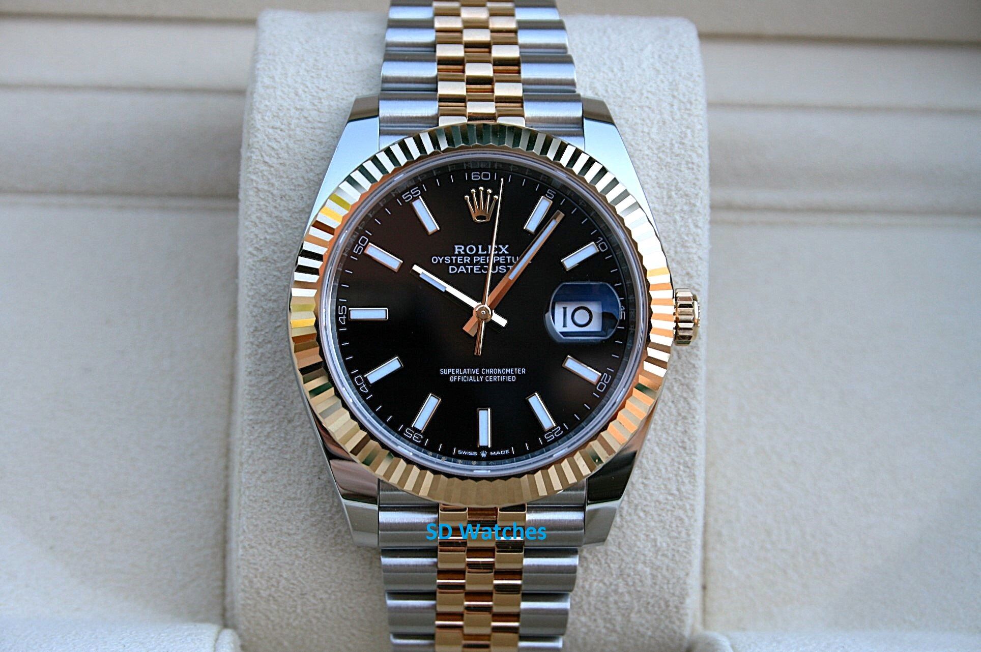 This watch comes in 41MM case, 18K/SS with fluted bezel and jubilee band with black Stick dial.