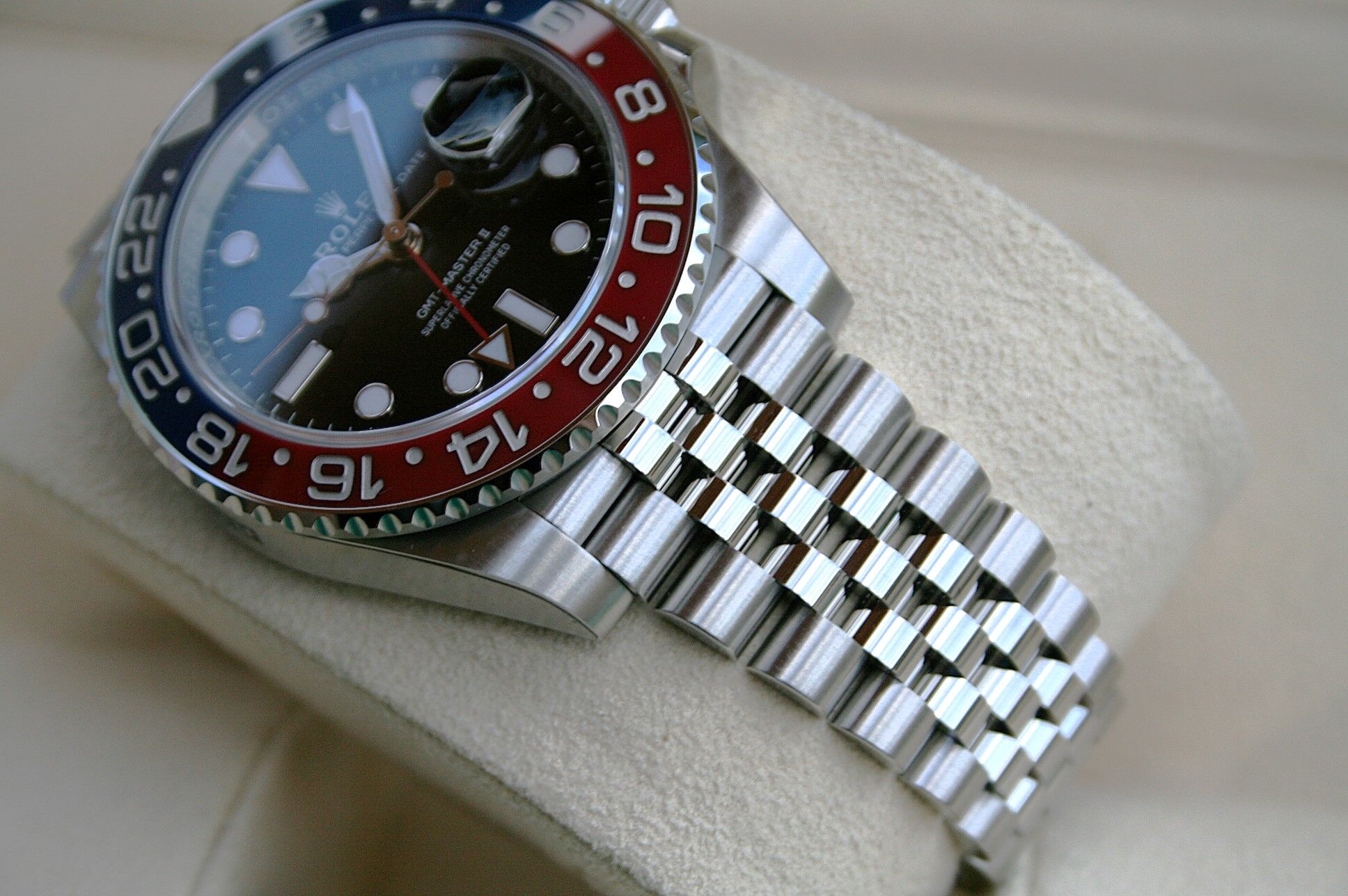 This GMT comes in 40MM case, Stainless Steel with Red and Blue Pepsi Bezel on a Jubilee Band.