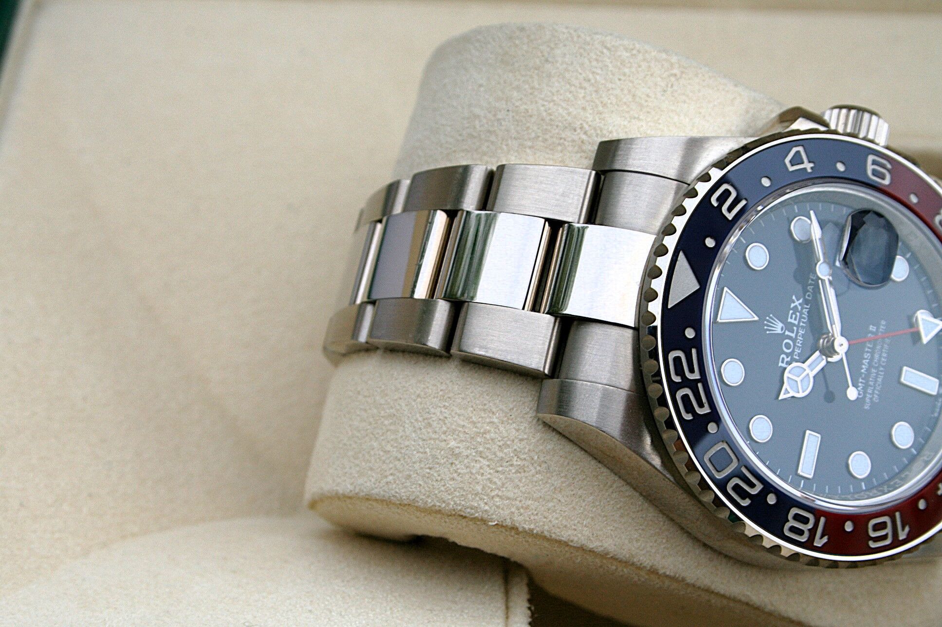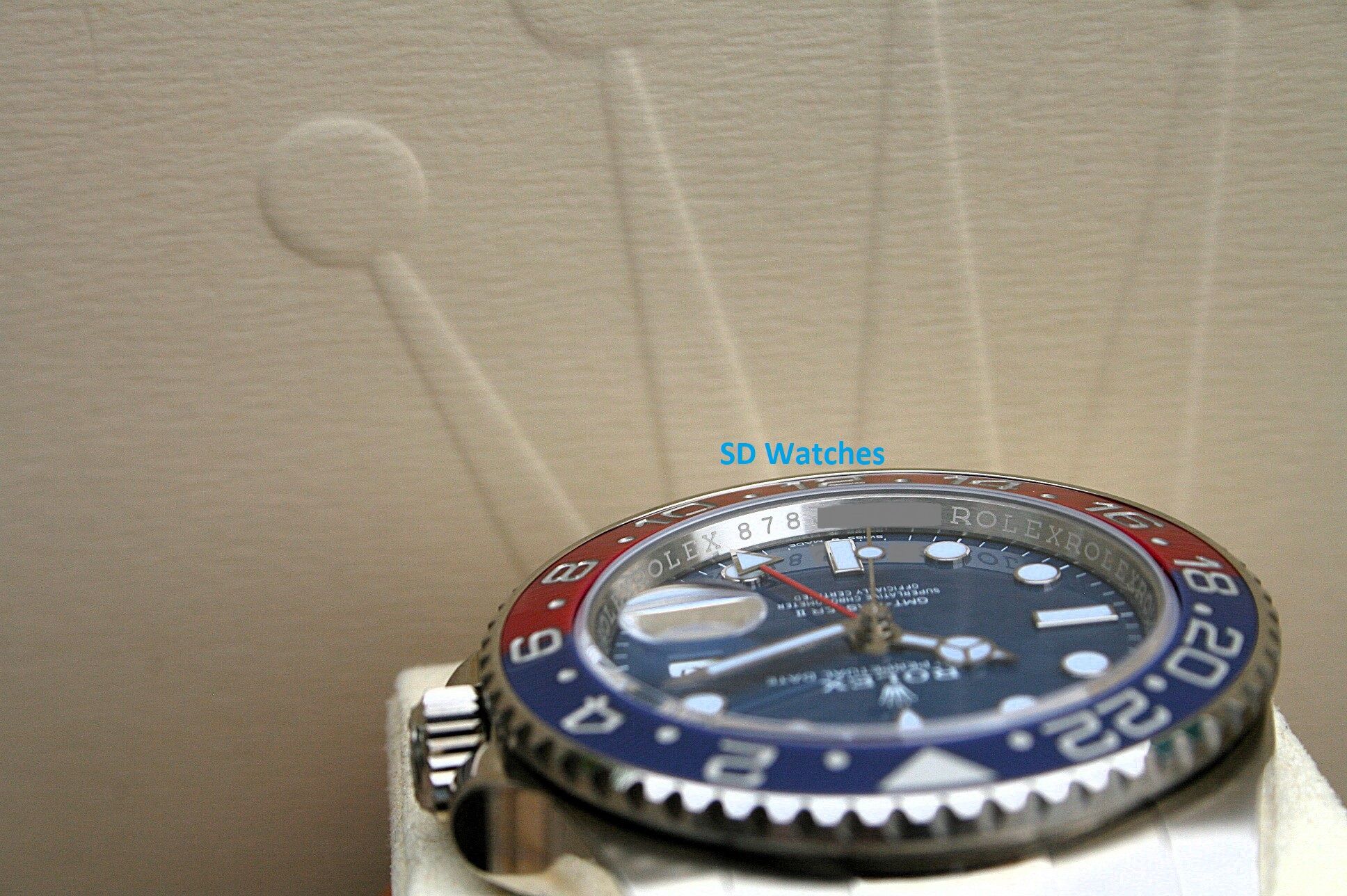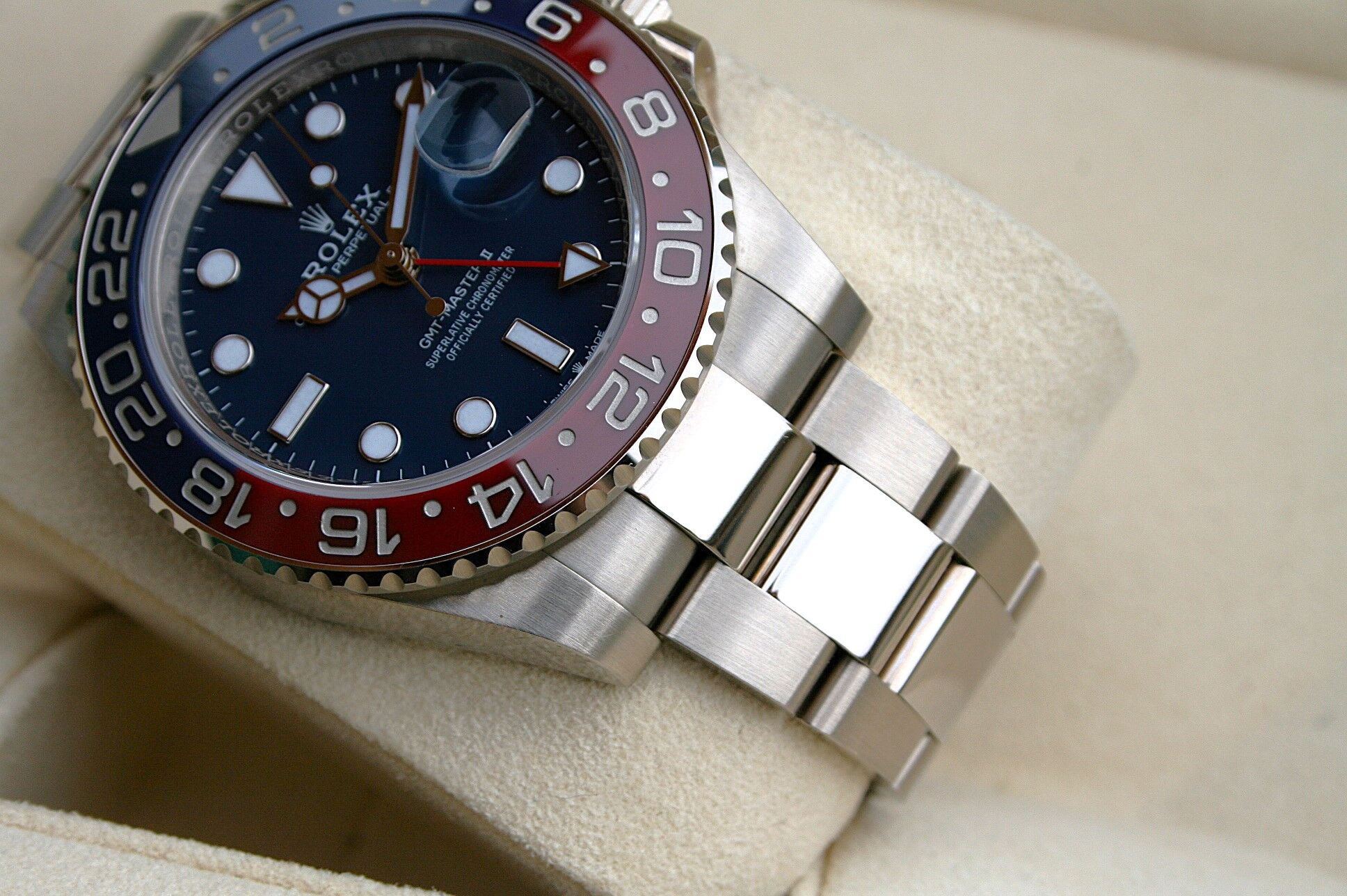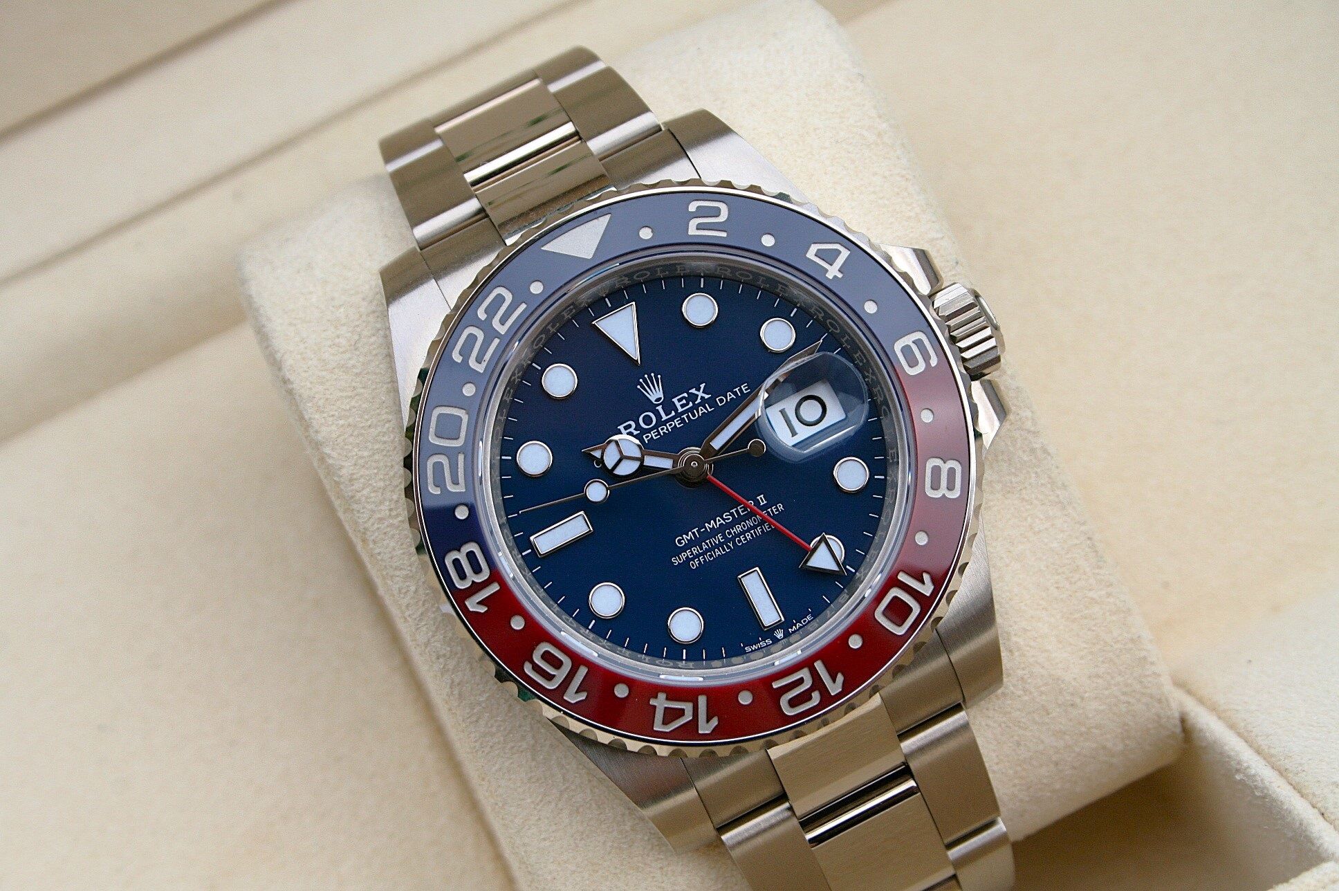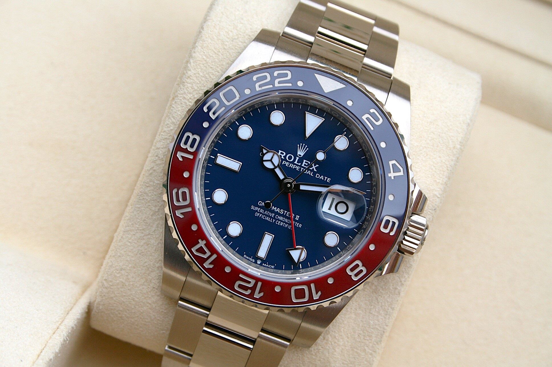 This watch comes in 18K White gold, 40MM case with Blue dial and red and blue bezel known as Pepsi GMT II.