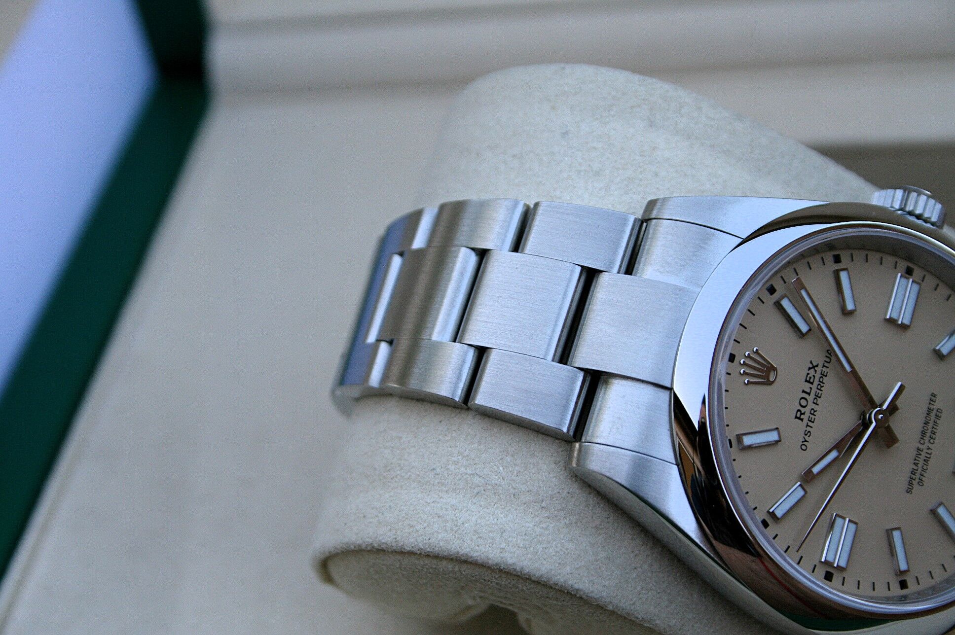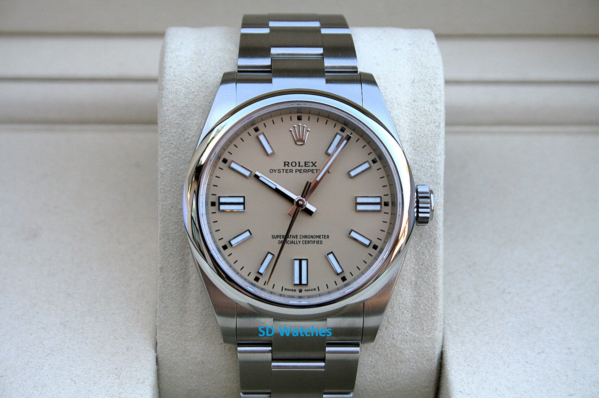 This watch comes in 41MM case, Stainless Steel with Smooth bezel and Oyster band, it has the beige marker dial.