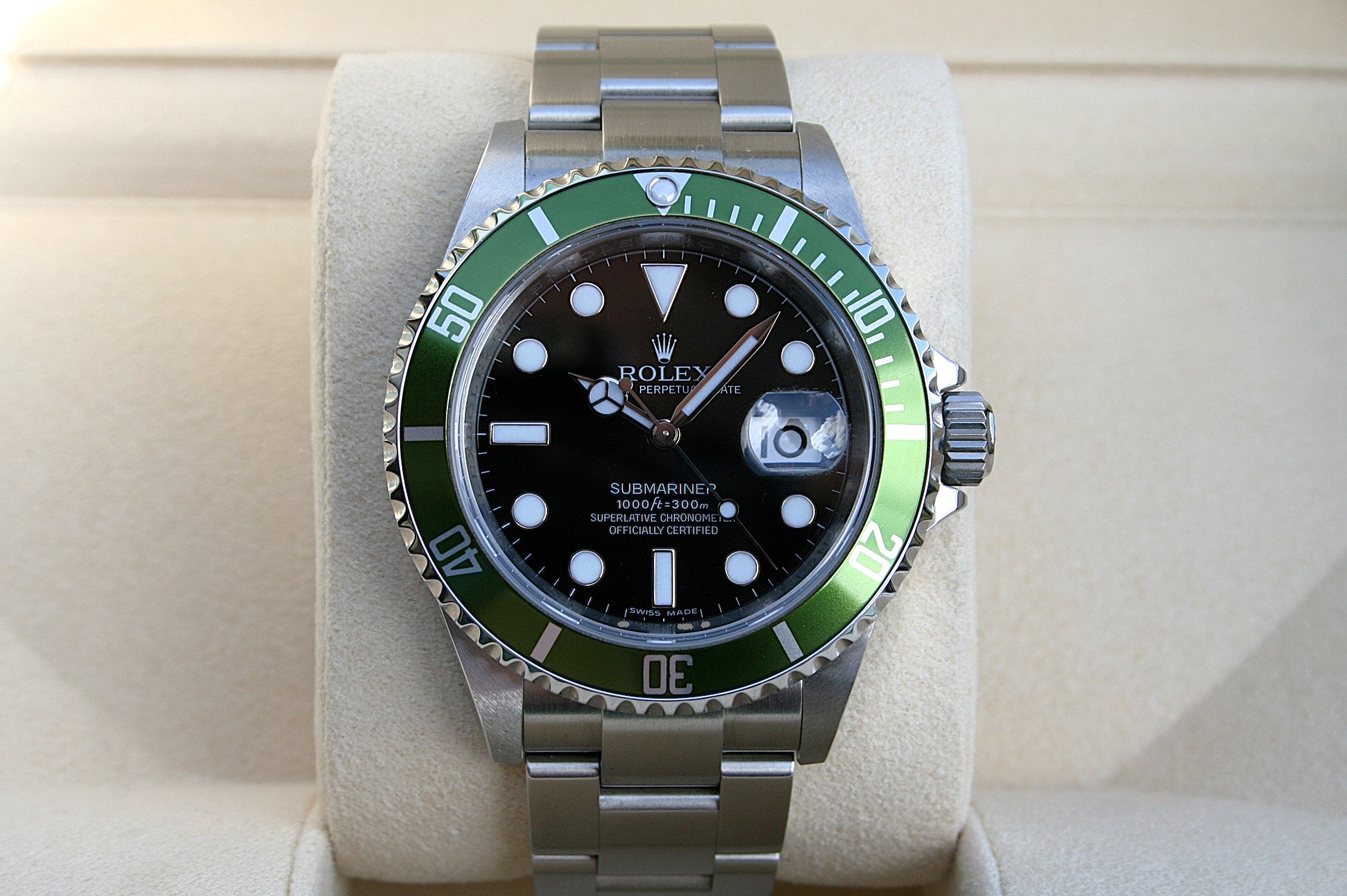 I have for sale a Rolex Anniversary Submariner model 16610Lv also known as Kermit that comes in near mint original unpolished 96% condition.