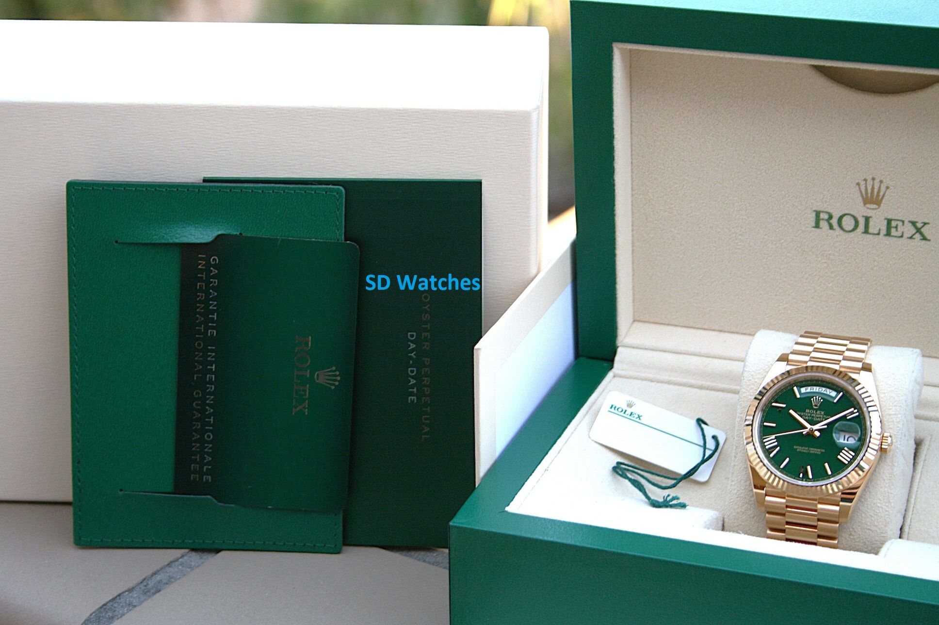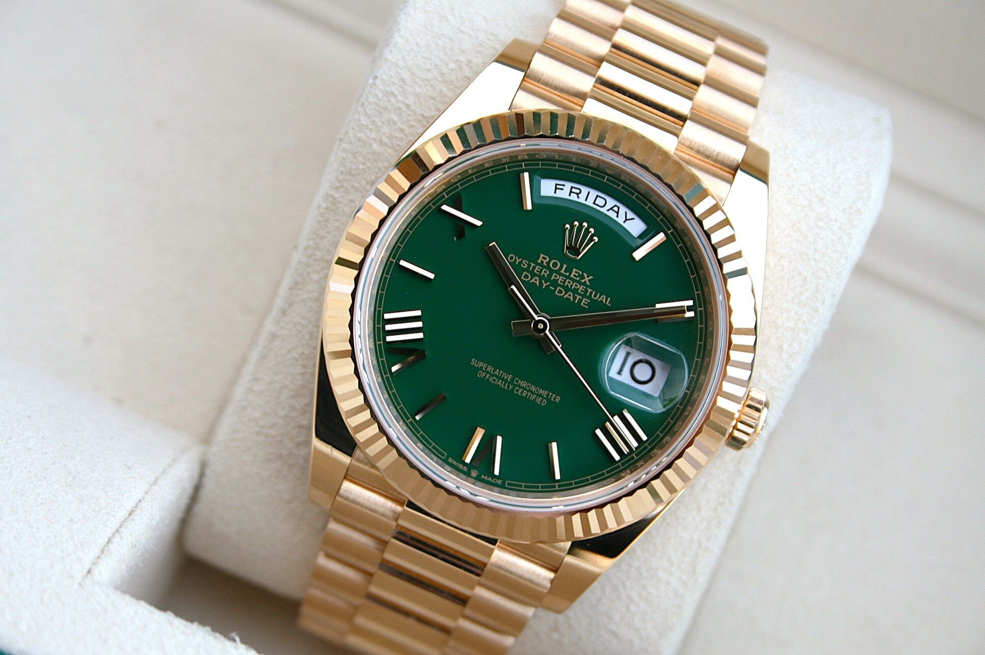 This watch comes in 18K Yellow gold, 40MM case with President band and Green Roman known as Green Money dial and a fluted bezel.